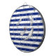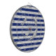 A silver chrome like diver and sharks design on a navy blue stripes decor. A modern nautical gift.