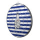 A silver chrome like lighthouse design on a navy blue stripes decor. A modern nautical gift.