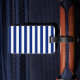 A silver chrome like wheel design on a navy blue stripes decor. A modern nautical gift.
