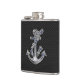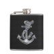 A modern nautical style silver chrome like applique on a racy black carbon fiber print decor for a fine custom flask gift.