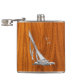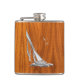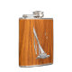 A modern nautical style silver chrome like applique on a teak wood print decor for a fine custom flask gift.