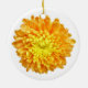 Round ornament with the photo of a red, orange and yellow Chrysanthemum.