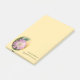 This sticky note pad is decorated with floral artwork depicting a purple-pink and creamy white chrysanthemum blossom with a bud and leaf set against golden yellow ochre and olive green along with custom text in a dark green hue.