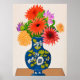 A semi-abstract digital still life of coral orange and mustard yellow chrysanthemums in a dark blue, antique style, Chinese vase