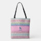 Carry your essentials in style with this unique tote bag featuring a beautiful multicolor chunky knit pattern in soft pastel shades (pink, blue, mint). It's personalized with a large initial and custom name on a bright pink banner. Perfect as a market bag, beach tote, or a personalized gift for knitters and pastel lovers!