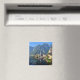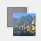 Souvenir photo magnet of a landscape with the church and the houses of the small village of Hallstatt in Austria, with reflection in the still water of Hallstatt lake and in the background the Alps mountains on a beautiful clear sky summer day with the text: 'Hallstatt, Austria'.