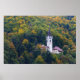 Poster print of a church surrounded by trees in a forest in fall colors on the hills around Bled Lake in Slovenia in autumn.