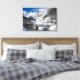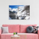 Canvas landscape print of the famous St. Sebastian church in the snow backed by high Alps mountains with a bridge and a small brook in Ramsau b. Berchtesgaden, near Austria in Germany in winter.