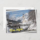 Photo postcard of a church under a layer of snow next to a mountain stream and a bridge with Alps mountains in the background in a winter landscape in Ramsau bei Berchtesgaden in the Berchtesgadener Land in Bavaria, southern Germany, near the border with Austria with a white edge and in yellow the text 'The Alps'. The image is a bit rotated to create the illusion of it laying loose.