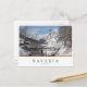 Photo postcard of a church under a layer of snow next to a mountain stream and a bridge with Alps mountains in the background in a winter landscape in Ramsau bei Berchtesgaden in the Berchtesgadener Land in Bavaria, southern Germany, near the border with Austria with a white edge and in a white box the text 'Bavaria, Germany', with stripes in black, red and yellow, the colors of the german flag.