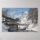 Poster print of a church under a layer of snow next to a mountain stream and a bridge with Alps mountains in the background in a winter landscape in Ramsau bei Berchtesgaden in the Berchtesgadener Land in Bavaria, southern Germany, near the border with Austria.