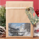 Rectangular photo sticker with a church under a layer of snow next to a mountain stream and a bridge with Alps mountains in the background in a winter landscape in Ramsau bei Berchtesgaden in the Berchtesgadener Land in Bavaria, southern Germany, near the border with Austria.