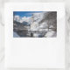 Rectangular photo sticker with the famous St. Sebastian church in the snow backed by high Alps mountains with a bridge and a small brook in Ramsau b. Berchtesgaden, near Austria in Germany in winter.