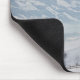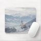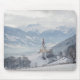 Mousepad with the church of St. Pankraz in an alpine landscape in the snow surrounded by clouds and fog on a hill with a view over Zillertal valley with the Alps mountains in the background in Fügen, Austria in winter.