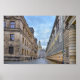 AugustusStrasse, a cobblestone street in the old town area of Dresden, Germany, is flanked by historic European buildings, with the prominent ornate tile mural of the Procession of Princes (Fürstenzug) on the right wall. In the distance, the baroque dome of the Frauenkirche (Church of Our Lady) rises against a partly cloudy sky.