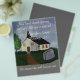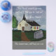 Digital drawing of a small country church, clear blue sky, a tree on green lawn landscape.