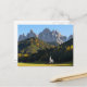 Postcard with the church San Giovanni in Ranui in front of Dolomites mountain peaks in autumn in Santa Maddalena in the Val di Funes, South Tyrol, Italy.