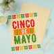 This vibrant flyer celebrates Cinco de Mayo with a lively and festive design that captures the essence of this cultural celebration. The top of the flyer features a series of colorful, decorative papel picado banners with intricate patterns in hues of green, yellow, and red, evoking the traditional hand-cut decorations often seen during Mexican festivities. Below, the words "CINCO DE MAYO" are boldly presented in a playful, chunky font that stands out against the pale background. Each letter is adorned with a texture that hints at fabric or a dotted pattern, adding a tactile dimension to the visual. The letters alternate in bright colors—red, orange, and green—that are quintessential to the festive color palette.