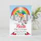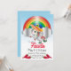 Festive holiday invitation for Cinco de Mayo or any Mexican-themed birthday or event with a unicorn Pegasus with a mane, tail, and hoofs in the colors of the Mexican Flag, wearing a sombrero. Sky background with a rainbow and a border of chili peppers.