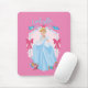 Cinderella in an orante blue frame in her magical dress accompanied by her bird friends as well as Gus and Rufus.