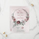 Beautiful botanical save the date card featuring romantic pink, white and cinnamon rose/ chianti flowers with green leaves arranged on a circle to form a pretty wreath.
