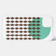 This phone case has a mid-century modern design with a sea-green circle with brown diamond chains.