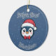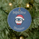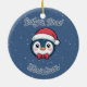 Featuring a cheerful penguin in a Santa hat and bow tie with snowy accents, this circle-shaped ceramic ornament is a timeless keepsake.