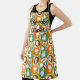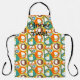 This apron has a mid-century modern design of circles and semi-circles in orange, yellow, green, brown, and turquoise on a field of white. If you want the same design with different colors, message me.