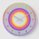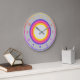 This wall clocks face is rings of colors of the rainbow as are the numbers of the clock. It is bright, cheerful and as colorful as a rainbow against a background of gray.