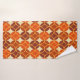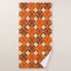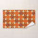 This towel set has a mid-century modern design of open circles on closed circles in orange and brown on a field of cream.