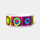 This is a heavy, durable bowl decorated with Tibbies of many colors, the perfect size for hungry/thirsty Tibs. The design is interesting and printing clear.