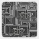 This work features an intricate, abstract pattern of nested squares and rectangles, outlined in white against a black background. The geometric forms are densely packed, with varying levels of depth created by multiple layers of lines. Some squares appear to interlock or overlap, giving the impression of a complex circuit board, digital maze, or futuristic cityscape. The overall effect is hypnotic and mesmerizing, evoking themes of digital complexity, structured chaos, and algorithmic design. It could be interpreted as a representation of information flow, cybernetic structures, or even a stylized urban landscape viewed from above.