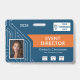 Establish a commanding and professional presence at your next tech summit with this sleek, customizable Event Director photo ID badge. Designed specifically for the high-stakes environment of technology conventions, this horizontal credential features a striking modern circuit-board aesthetic that instantly identifies your leadership team. The intuitive layout allows you to maintain total brand consistency by uploading your official event logo, a high-resolution professional headshot, and up to three prominent sponsor logos directly onto the front of the card. Shown in a blue, orange, and white palette, but all colors are editable to match your branding.