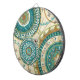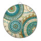 © Veronique Charron / Wild Apple. This image of circular patterns feature blue and gold colors. The image has a tan colored, floral patterned background.