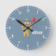Cute blue wall clock for a nursery or a kid's room featuring an elephant clown . Personalize it with the child's name