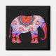 This square magnet is printed with a colorful kaleidoscope elephant in blue, orange, and lavender with a black background.