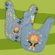 Adorable blue bib with a circus theme . It has a juggling lion on the front and a pattern of this same cartoon animal on the back . Personalize with the baby's name if you wish using the provided template field .
