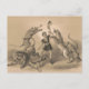 Vintage print of a male circus performer standing among a lion, a tiger, two wolves, and a leopard; he is holding a large piece of beef overhead with his left hand, circa 1872