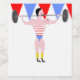 Charming hand-drawn and colored Circus Strong Man in a red and white striped vest, blue pants, and black and yellow boots shows off his super-human strength at a red, yellow and blue Circus theme party