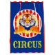 A daring Circus Tiger jumps through a ring-of-fire with Big Top red and White Stripes!! Text: CIRCUS