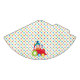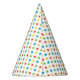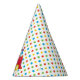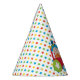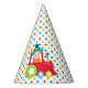 This circus themed party hat features a repeating pattern of red, yellow, blue and green stars and a clipart graphic of a red circus train engine carrying a funny clown with blue hair.