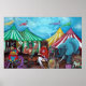 A Bright and Cheerful Circus Scene of Cartoon Esq.Sideshow Freaks. Included in this artwork is a rare blue elephant balancing on a ball, A short clown with a hammer, a red headed bearded lady in her leopard skin costume, 2 pickled punks, conjoined twins, a strong man, lady sword swallower and 2 fat twins riding a tricycle with their pet purple people eater. Cirque De Freaks by Laura Barbosa.