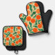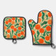 Brighten up your kitchen with this vibrant orange citrus oven mitt and pot holder set. Featuring a refreshing hand-painted botanical pattern of juicy oranges and lush green leaves, this set is the perfect combination of practical protection and stylish kitchen decor.