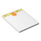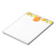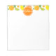 A white notepad with a pattern of smiling orange, lime, grapefruit, and lemon characters with green leaves. At the top is a name and monogram combination that can be customized. The pad is mostly blank with plenty of space for writing.