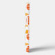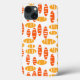 This phone case has a repeating pattern of ovals in retro orange and yellow with scattered white ovals all on a field of white.