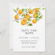 Rustic and modern save the date card featuring watercolor illustration of orange fruits on a tree branch.