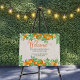 Welcome sign with citrus oranges with orange flower blossoms and botanical greenery. "welcome" is curly calligraphy and the template is set up to edit the remaining text. The wording currently reads "please help yourself to a glass of fresh orange juice .. [name's] baby shower [date]" which you can easily customize.