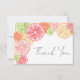 This flat thank you card features a bright and cheerful citrus theme, perfect for summer celebrations. The front design includes watercolor citrus slices—grapefruit, lime, lemon, and orange—in shades of pink, orange, yellow, and green, arranged along the top and left side. "Thank You" is displayed in the bottom right corner in a simple, elegant script.
