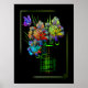 An iridescent butterfly takes a drink from these vivid, fanciful flowers in a city high-rise vase are richly textured to give the feel of a fine oil painting on black velvet.