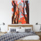 The image captures a vibrant autumn scene with a tall skyscraper peeking through a canopy of fiery red leaves. The branches of the trees, with their rough brown bark, frame the modern building, creating a striking contrast between nature and urban architecture. The leaves are a mix of deep crimson and orange, adding a warm and inviting feel to the composition.